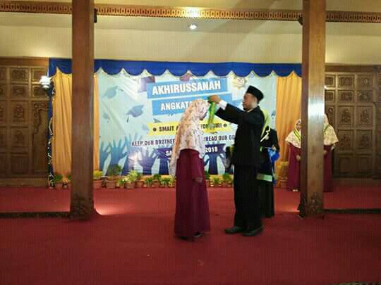 Setelah sambutan-sambutan, tibalah pada acara inti yaitu wisuda kelas XII. Prosesi wisuda berlangsung dengan khidmat dan penuh haru. Satu per satu kelas XII dipanggil ke panggung untuk menerima samir wisuda, sebagai tanda bahwa mereka sudah tidak lagi menjadi murid SMAIT Al Huda maupun santri dari PPIT Al Huda. Sekarang mereka resmi disebut alumni SMAIDA.