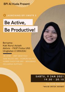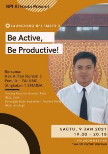 Begitulah kira-kira sepenggal nasehat yang disampaikan oleh Kak Alifian, alumni angkaran pertama, yang menjadi pembicara dalam Grand Opening BPI Semester Genap 2020/2021 yang diadakan via zoom. Acara yang diadakan pada Sabtu, 9/1/2021, ini merupakan agenda launching salah satu program unggulan SMAIDA yaitu Bina Pribadi Islami atau disingkat BPI. Agenda ini diadakan terpisah antara ikhwan dan akhwat, dengan akhwat diisi oleh Kak Nurul Azizah, alumni angkatan 2 SMAIDA yang sekarang aktif menjadi aktivis mahasiswa di UNS.