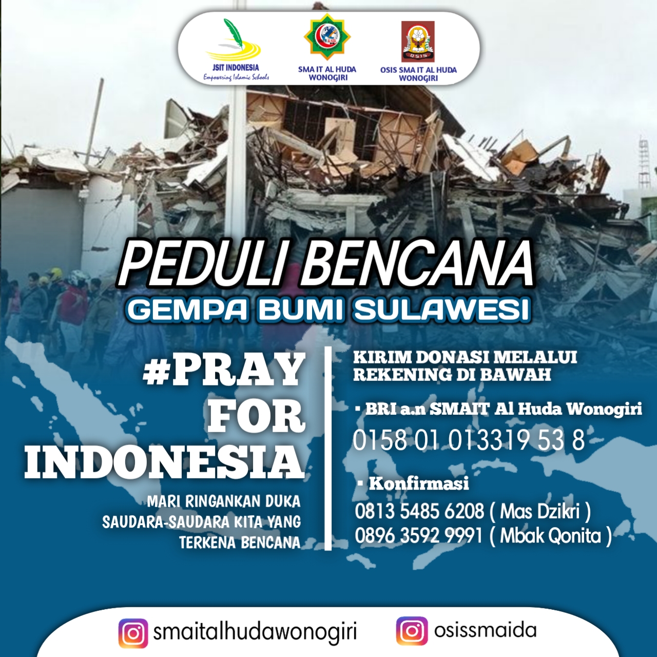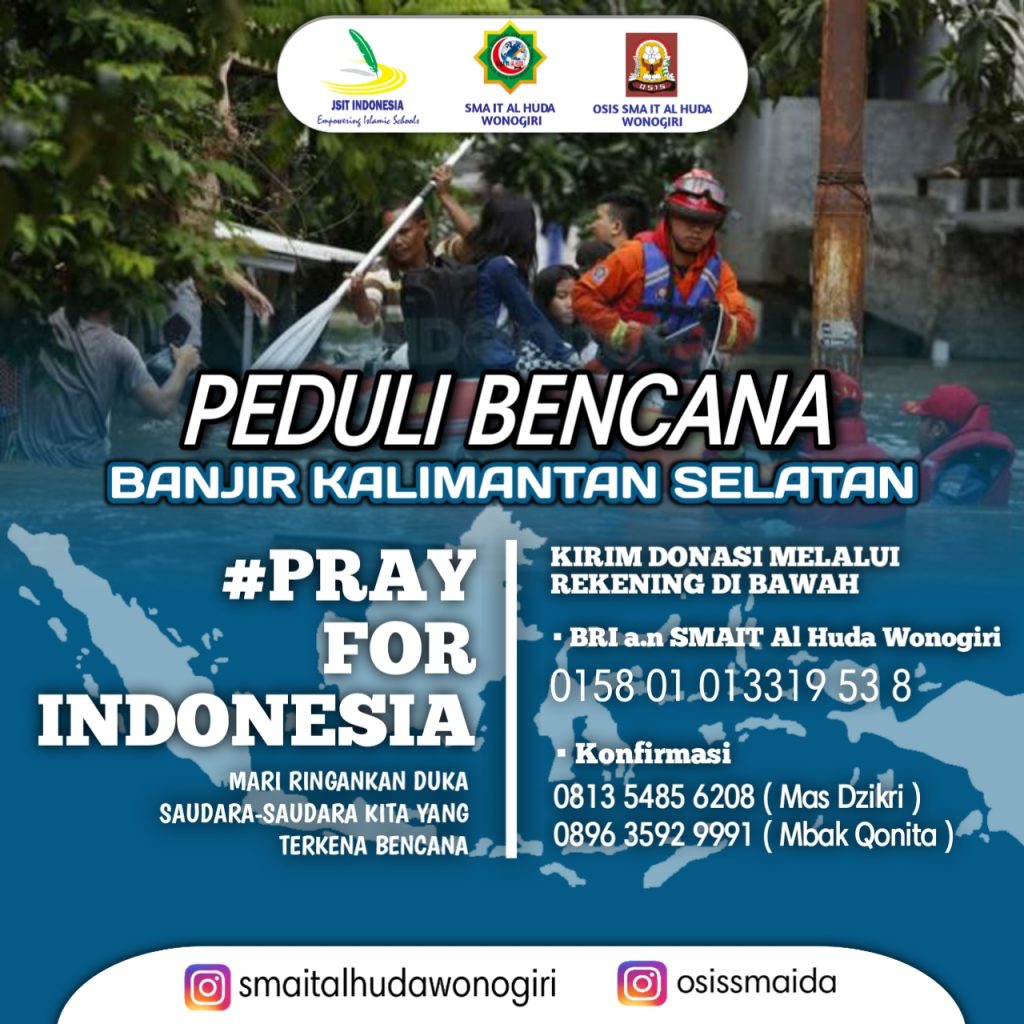 Indonesia tengah berduka. Bencana alam melanda bumi Nusantara tercinta. Banjir di Kalimantan Selatan, gempa bumi di Sulawesi Barat, belum lagi kecelakaan yang menimpa pesawat Sriwijaya Air, dan lainnya. Semuanya itu menjadikan kita selalu mawas diri. Bersimpati terhadap musibah yang menimpa saudara kita, juga seharusnya membuat hati kita terketuk untuk membantu meringankan beban saudara kita. OSIS SMAIT Al Huda berinisiatif untuk menjadi penyalur bagi muslimin wal muslimat sekalian yang ingin membantu saudara kita yang sedang tertimpa musibah.